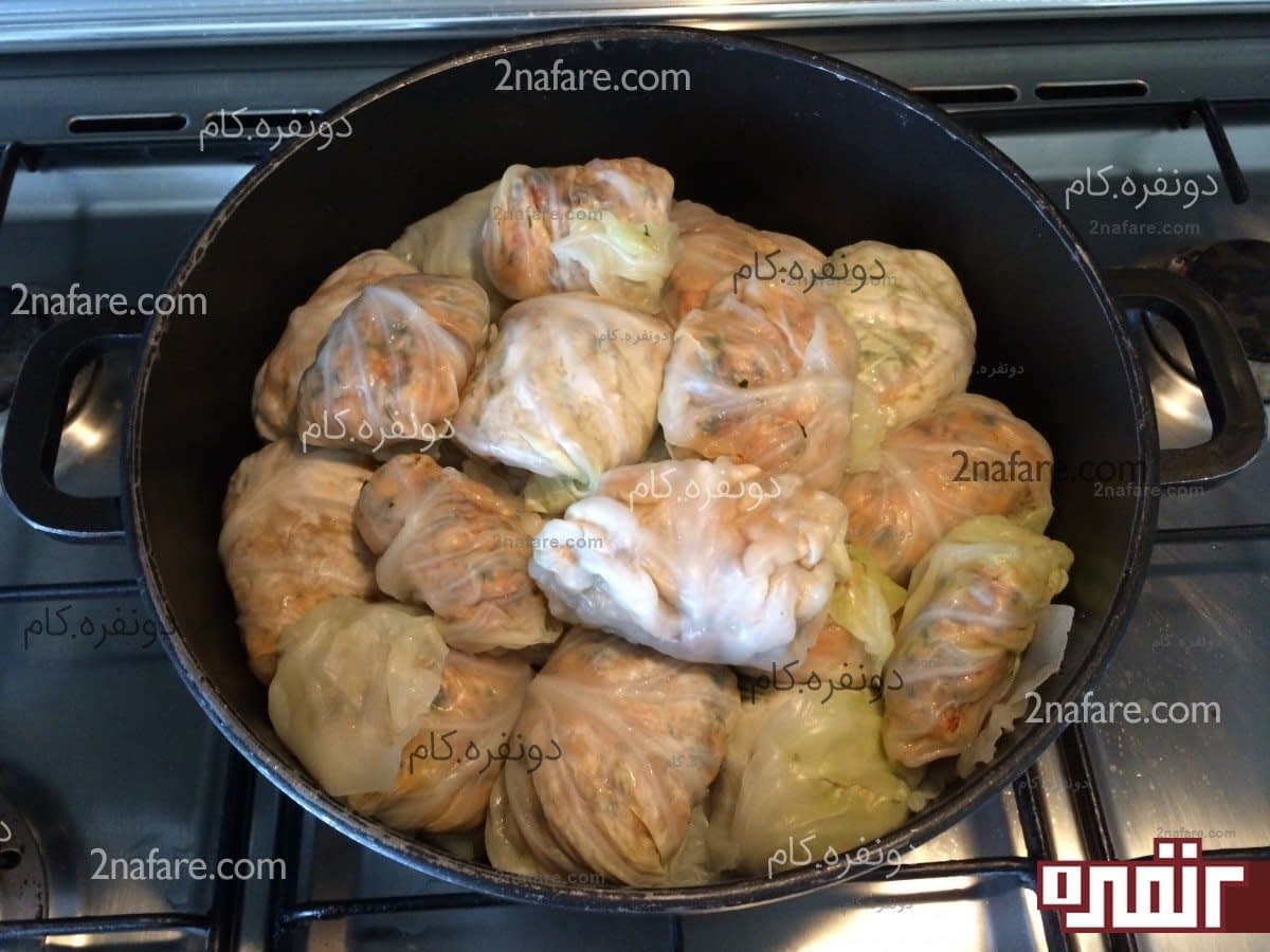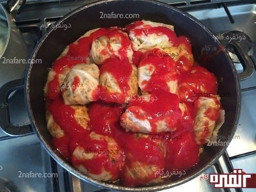 - اجازه دهید تا سس خوب به خورد دلمه ها برود . وفتی دلمه ما تنگ آب شد دلمه کلم پیچ ما آماده است.