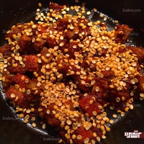 بعد از تفت دادن گوشت لپه خام رو هم اضافه میکنیم.