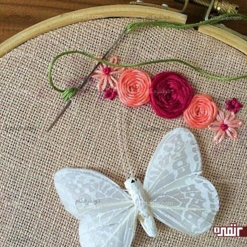 فضاهای خالیِ کار رو میتونید با دوخت های ساده مثل دوخت ستاره های کوچیک پر کنید. وسط گل هاتونم میتونید از مروارید یا گره فرانسوی استفاده کنید.