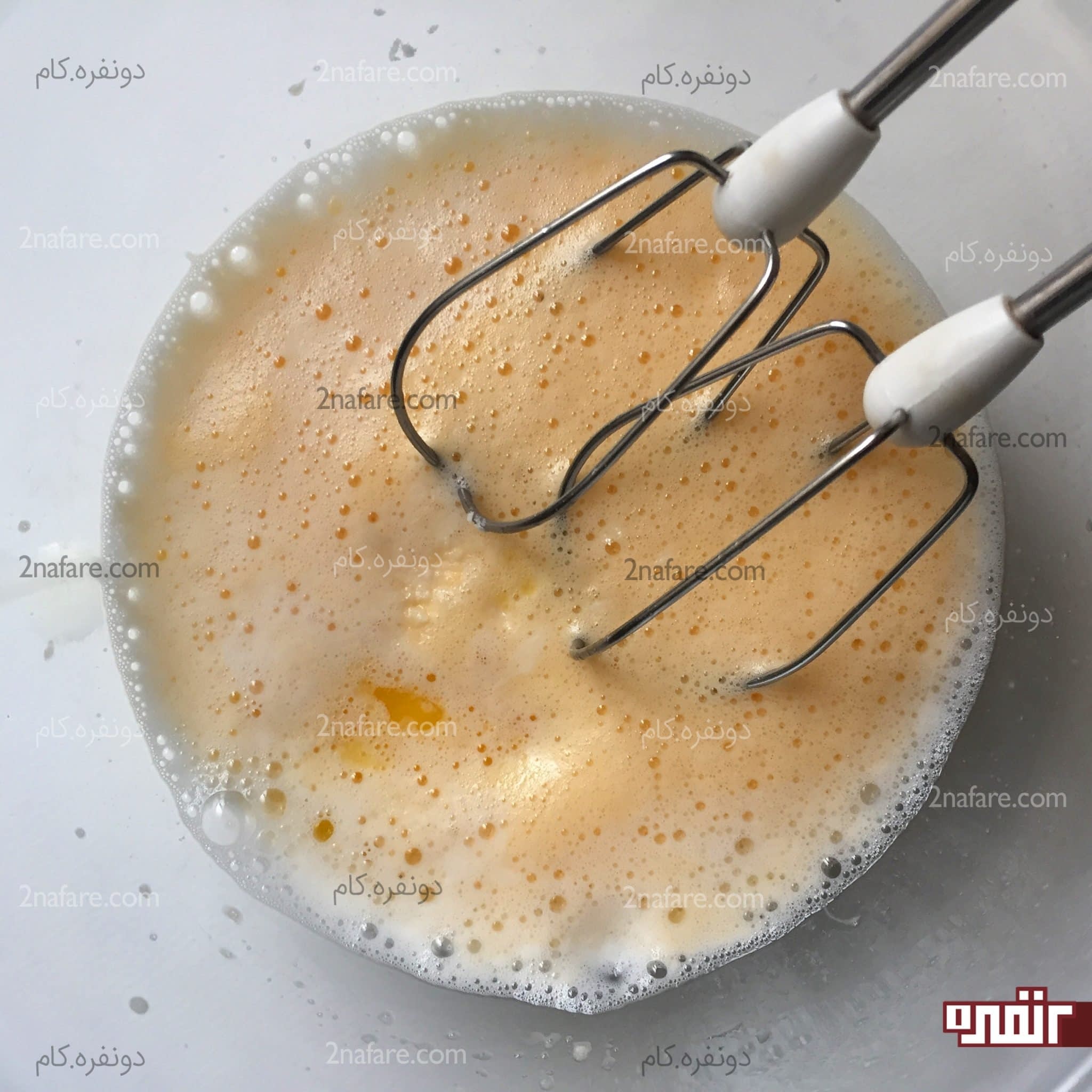 ابتدا تخم مرغ رو با همزن میزنیم تا کمی غلیظ شده و کف کنه.
