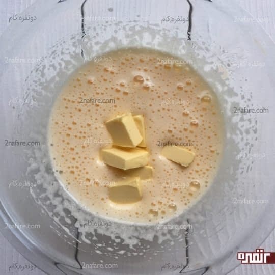 حالا کره رو که به دمای اتاق رسیده با چاقو تکه تکه کرده و به مخلوط اضافه میکنیم و با همزن میزنیم تا مخلوطمون یکنواخت بشه.