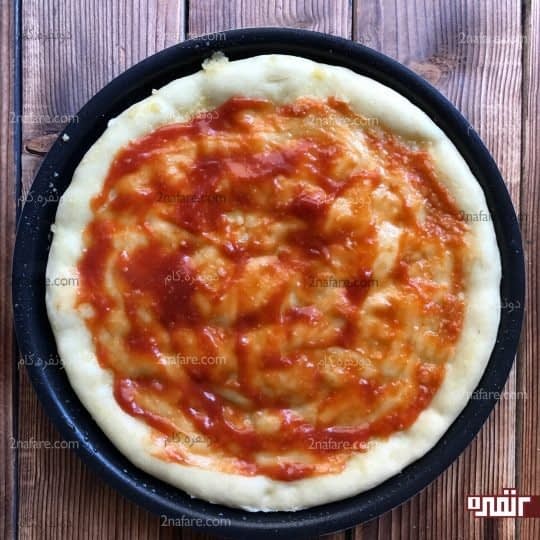سس گوجه فرنگی و کمی نمک رو هم کاملا روی سطح پیتزا پخش میکنیم البته یه سانت از دور خمیر رو بدون سس میذاریم.